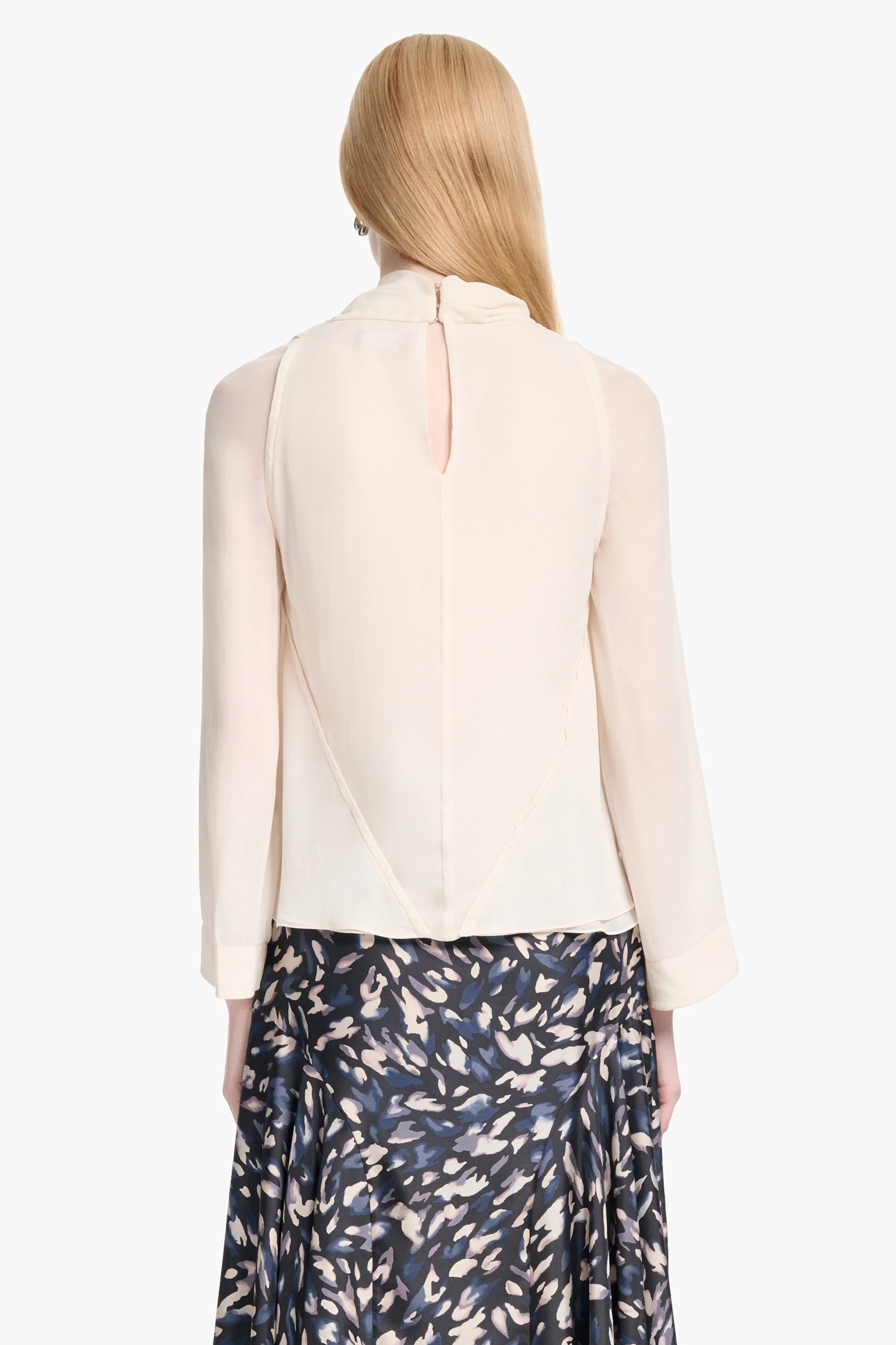 The Cara top is crafted in Italy with a buttoned high-neck and long bell sleeves, offering a refined, timeless drape.