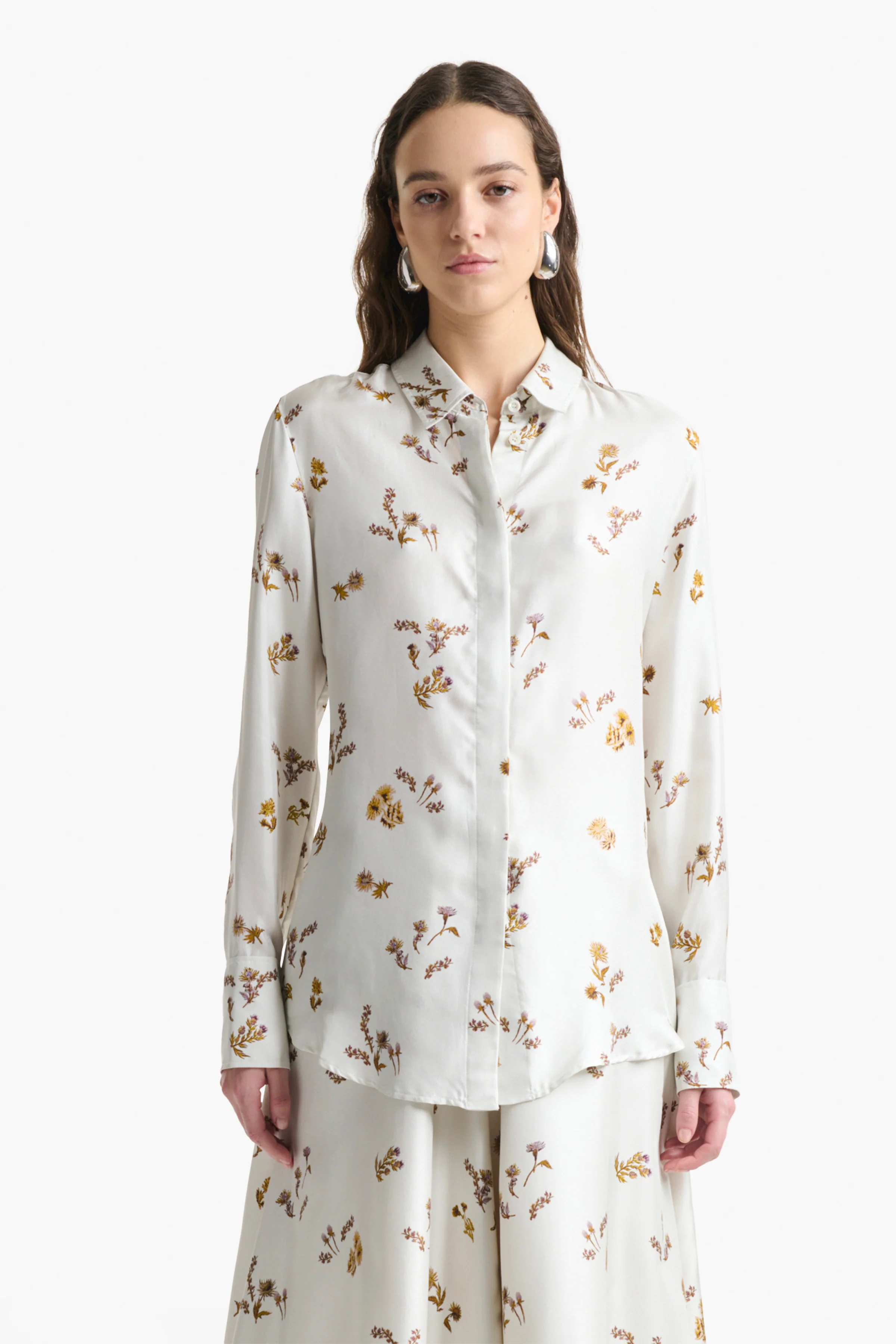 The Chika Top is a signature style in sheer chiffon. Capturing an easy elegance, the relaxed style features a small point collar, and a concealed button front closure.