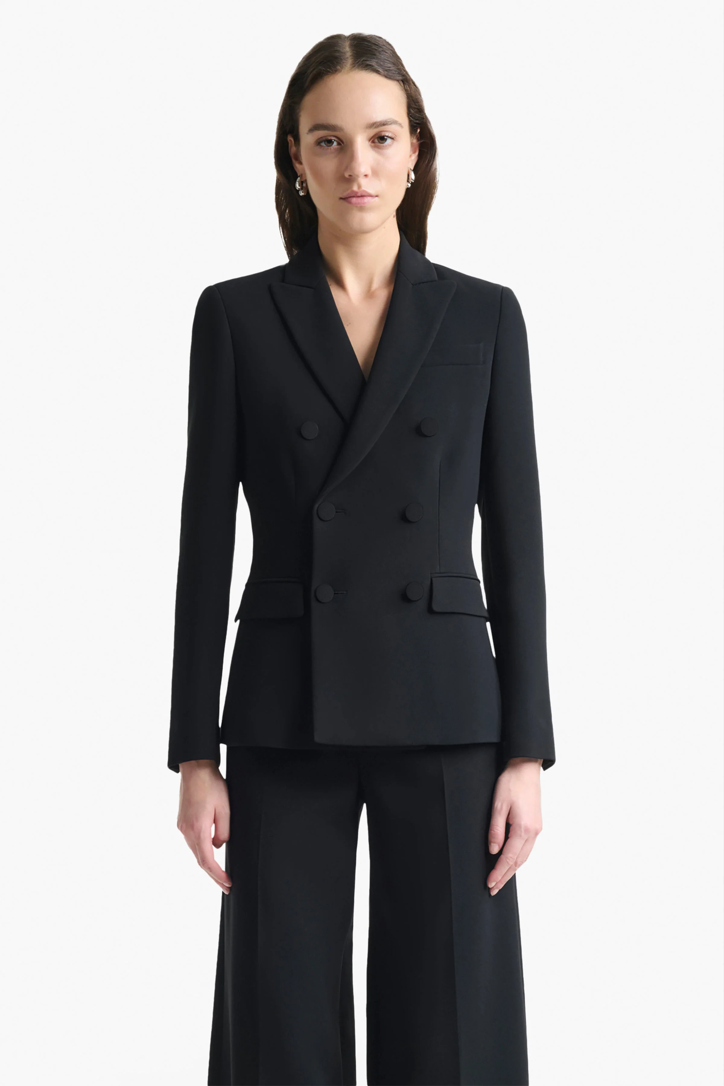 The Indiana Jacket is a signature style, tailored from crease-resistant fabric to a timeless double-breasted design with notched lapels. It falls to an elegant length just below the hip and it has two flap front pockets.