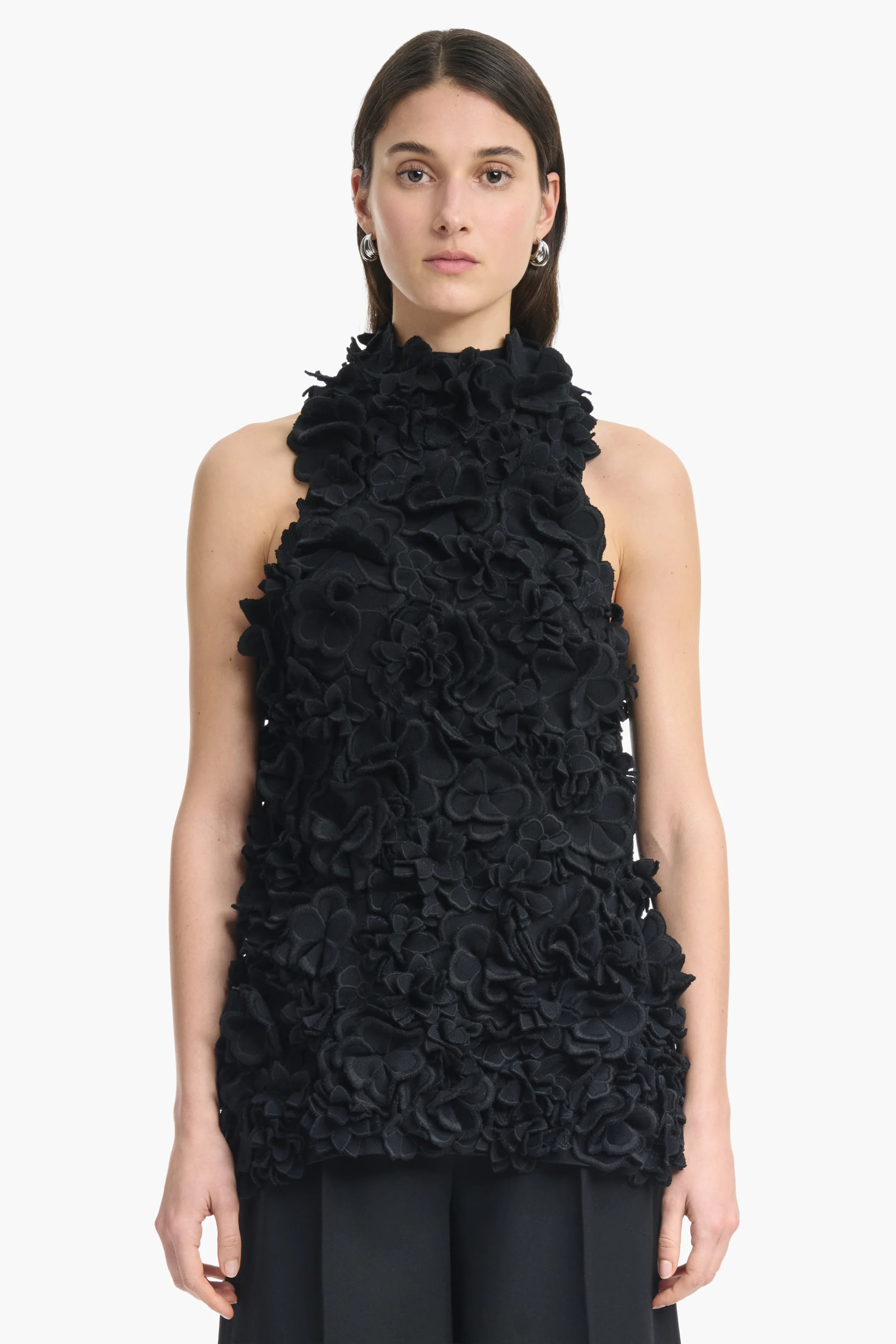 The Sigourney Top is crafted with an all-over three-dimensional floral appliqué that creates a sculptural, textured silhouette. Designed with a high neckline and a sleeveless cut, it falls straight through the body for a clean, structured shape.