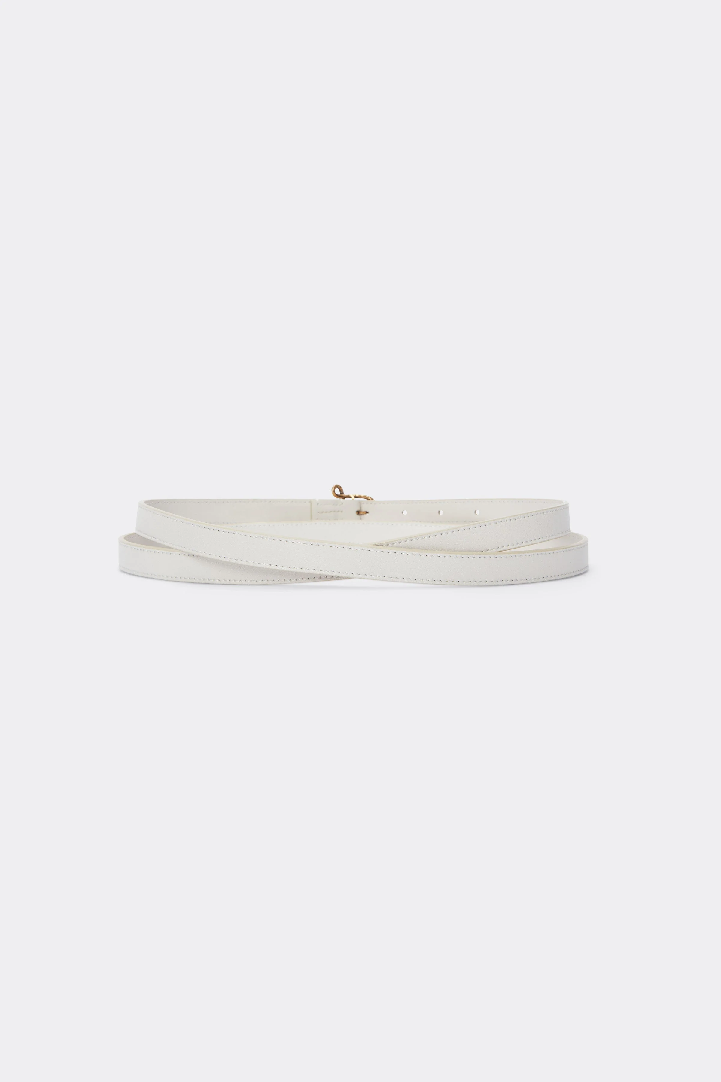 The Small A Belt is part of the Core Collection. Crafted in smooth white leather with visible topstitching. Features an abstract A-shaped buckle in textured gold metal at the center-front.